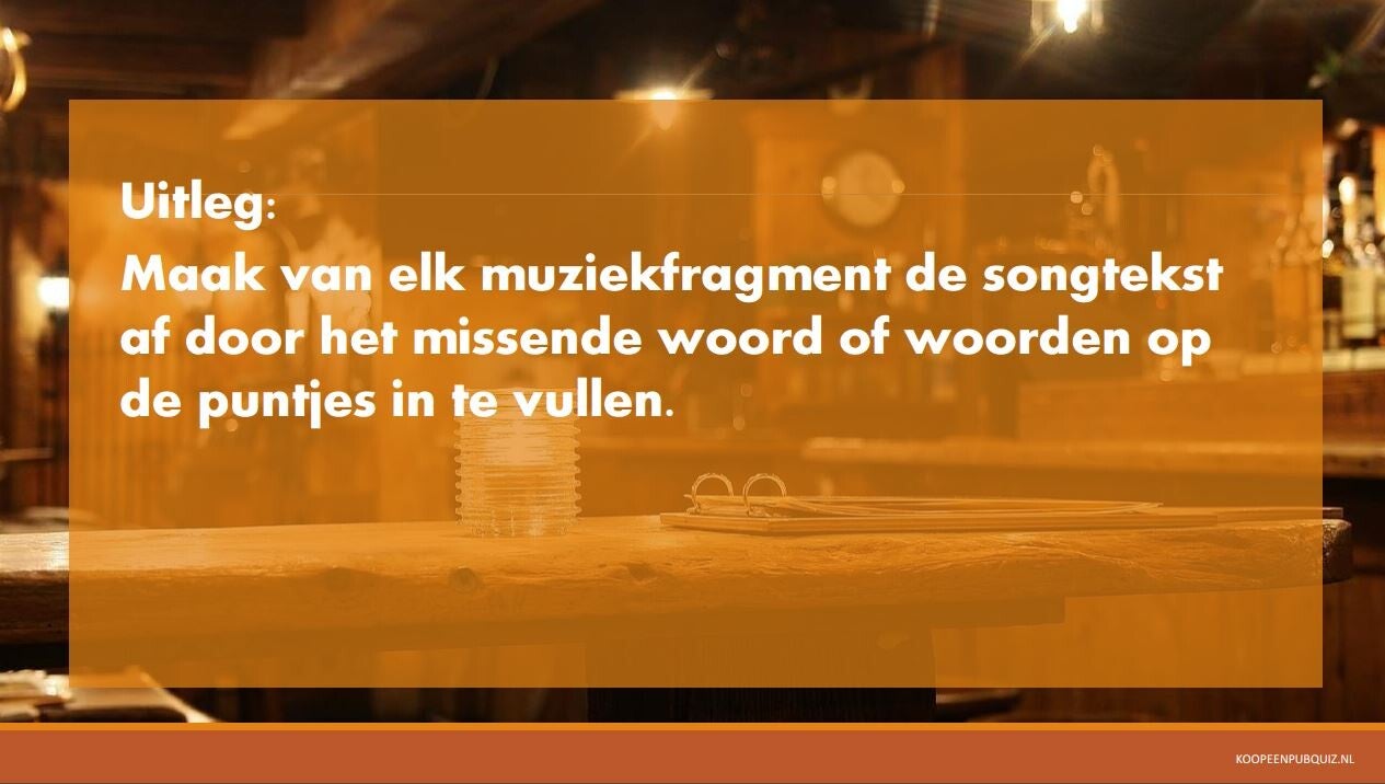Na aankoop kan je de pubquiz direct downloaden. De download bevat de pubquiz in powerpoint formaat en in .pdf formaat, een map met muziekfragmenten in .mp3 formaat en een antwoordformulier.